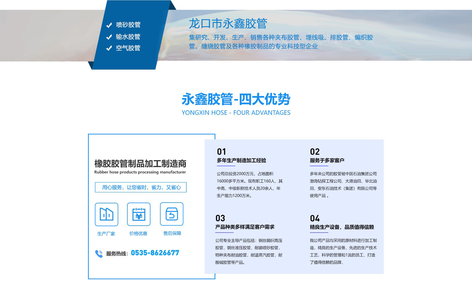 龍口市永鑫膠管有限公司始建于1979年。位于山東半島北端——龍口市,毗鄰龍口港、威烏高速公路和大萊龍鐵路,商業運輸,交通方便,地理位置好。公司總投資2000萬元,占地面積16000多平方米。現有職工160人,其中高、中級職稱技術人員20余人,年生產能力1200萬米。多年來公司的膠管被中國石油集團公司渤海鉆探工程公司、大港油田、華北油田、安東石油技術(集團)有限公司等使用產品我公司迎著十八界三中全會的改革大潮始終闊步向前,目前我公司主要從事高低壓橡膠軟管、鉆探膠管、夾布膠管、噴砂膠管、橡膠管帶制品,等產品的生產和研發,主導產品包括:生產,研制高低壓橡膠軟管、輸送皮帶等以橡塑為主的產品,擁有各類進口,國產生產設備120多臺套,化驗,分析,試驗儀器設備種類多,檢測手段完善。我公司產品均采用的原材料進行加工制造,精良的生產設備和穩定技術工藝,科學的管理,打造了客戶信任的牌子,先后與多家石油、化工、汽車制造等大型國有企...